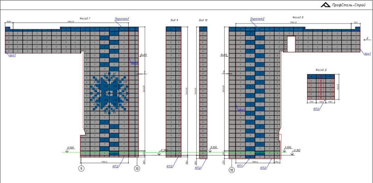 Для объекта разработана конструкторская документация, которая включает в себя раскладки панелей - законченное цветовое решение на каждый фасад, а также решение по исполнению декоративного элемента, который будет выполнен из двухцветных перфорированных панелей.